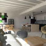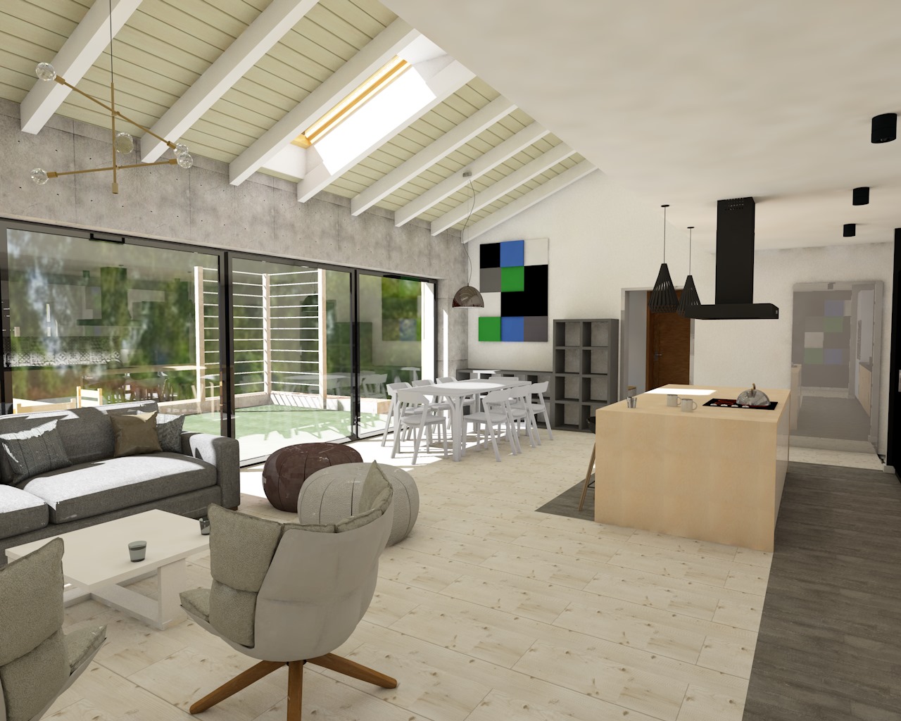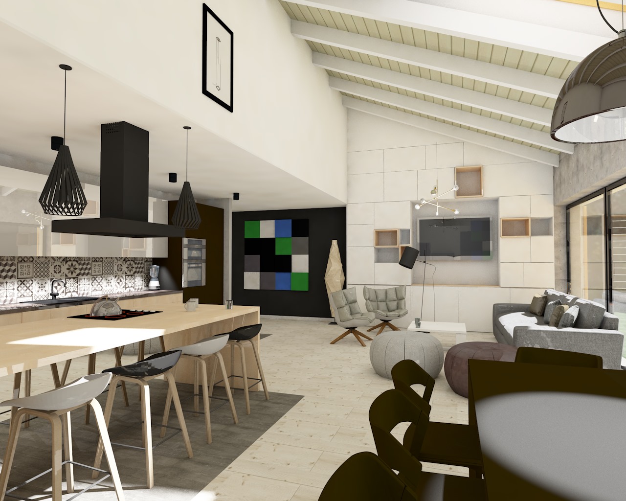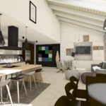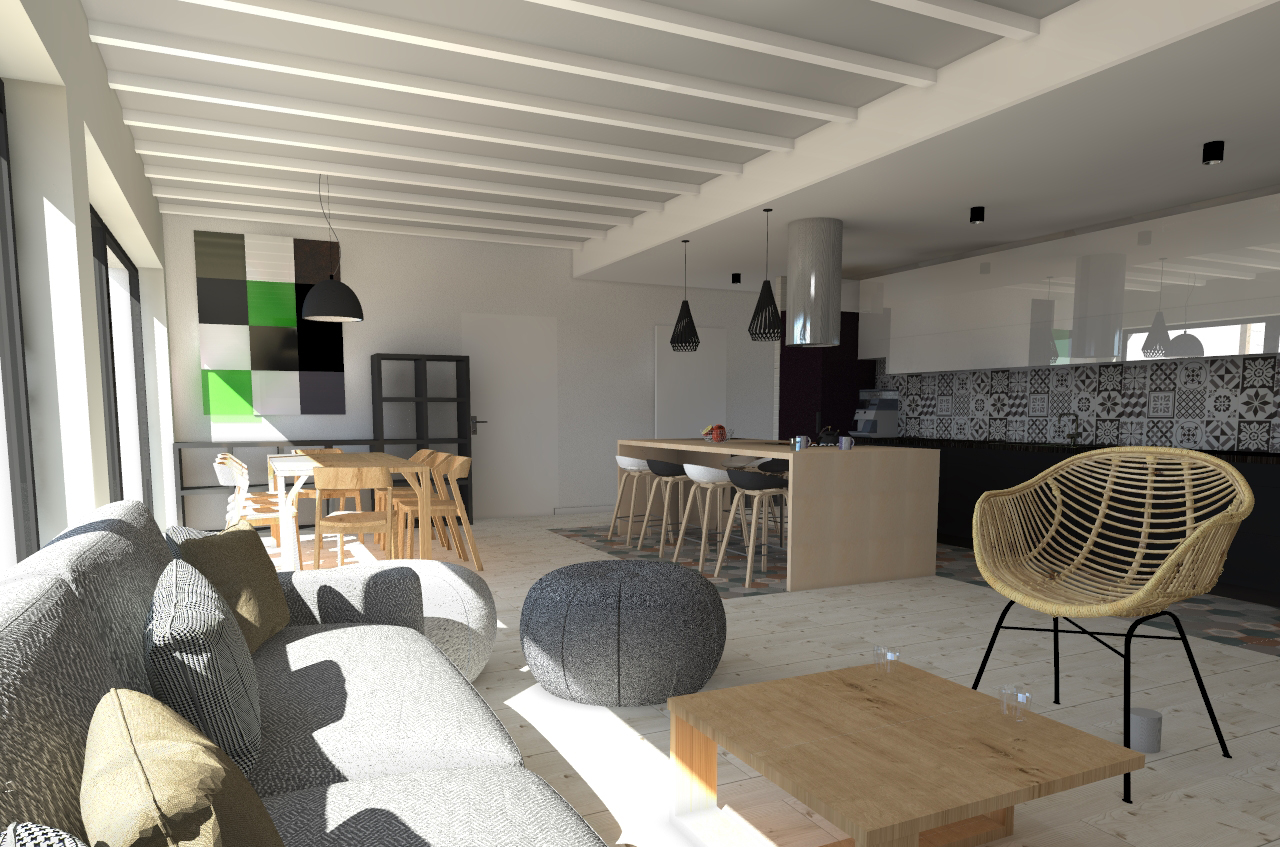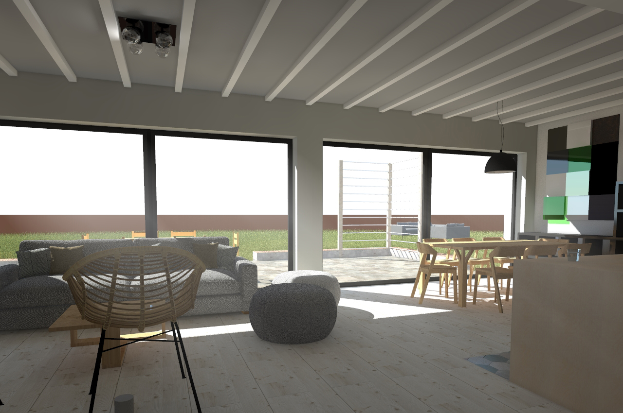 Strefa dzienna tego domu jednorodzinnego jest jednostrefowa. Kuchnia razem z jadalnią i salonem dla dużej rodziny z możliwością organizowania hucznych przyjęć przyniesie sporo przyjemnych chwil przy jednoczesnym wspaniałym widoku na ogród za dużymi oknami.